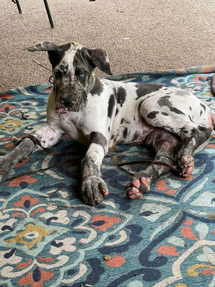 Introducing Cappy, our blue harlequin! He's the son of Luizador Cicero and Thursday of CMD. Cappy is full of energy and loves to run. Although he can be a handful at times, he's very sweet and affectionate, and loves to give kisses. He's Penn hip tested, heart, thyroid and IMGD tested, and will be available for stud summer of 2024 to approved females. He is 35-36 inches to the withers and 208 lbs. He is single kb.